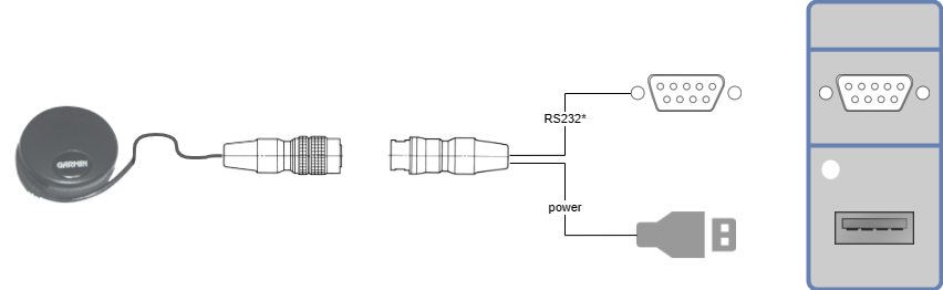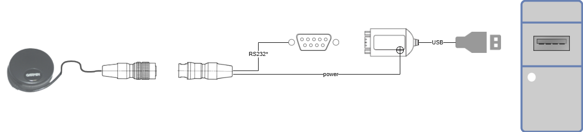 - PC – RS-232 serial interface*, with a DB9 connector to plug into a PC, and a massive cigarette lighter adapter plug to obtain power